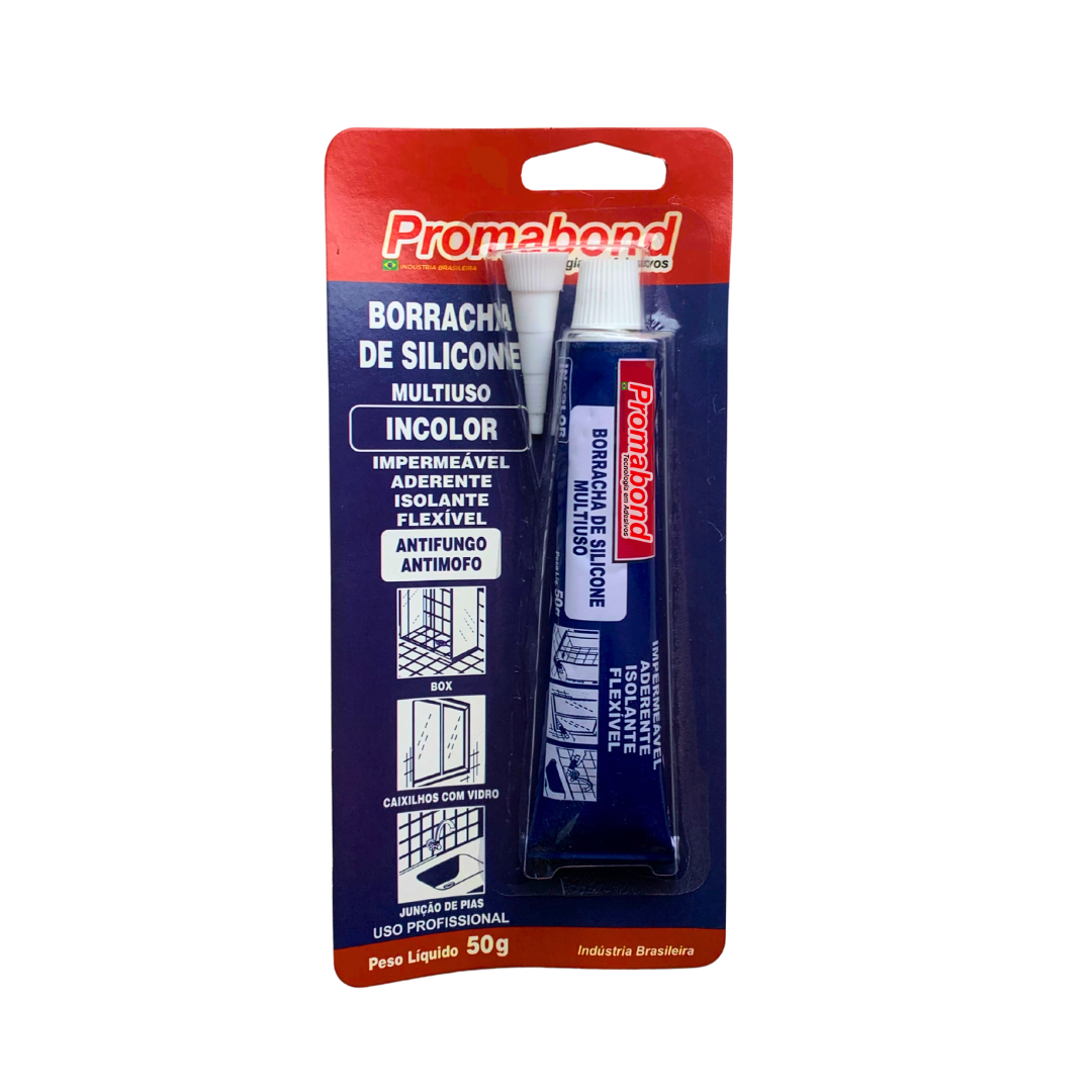 A Borracha de Silicone Multiuso Incolor Promabond é indicada para vedação de vazamento de água, cascos de barcos, telhas, calhas, janelas de alumínio, ralos, infiltrações em automóveis.